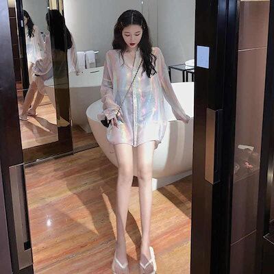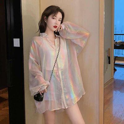 長袖ブラウス韓国ファッショシースルーシャツ長袖韓国薄手派手メタリックトップス上着 ゆったりフ レディース