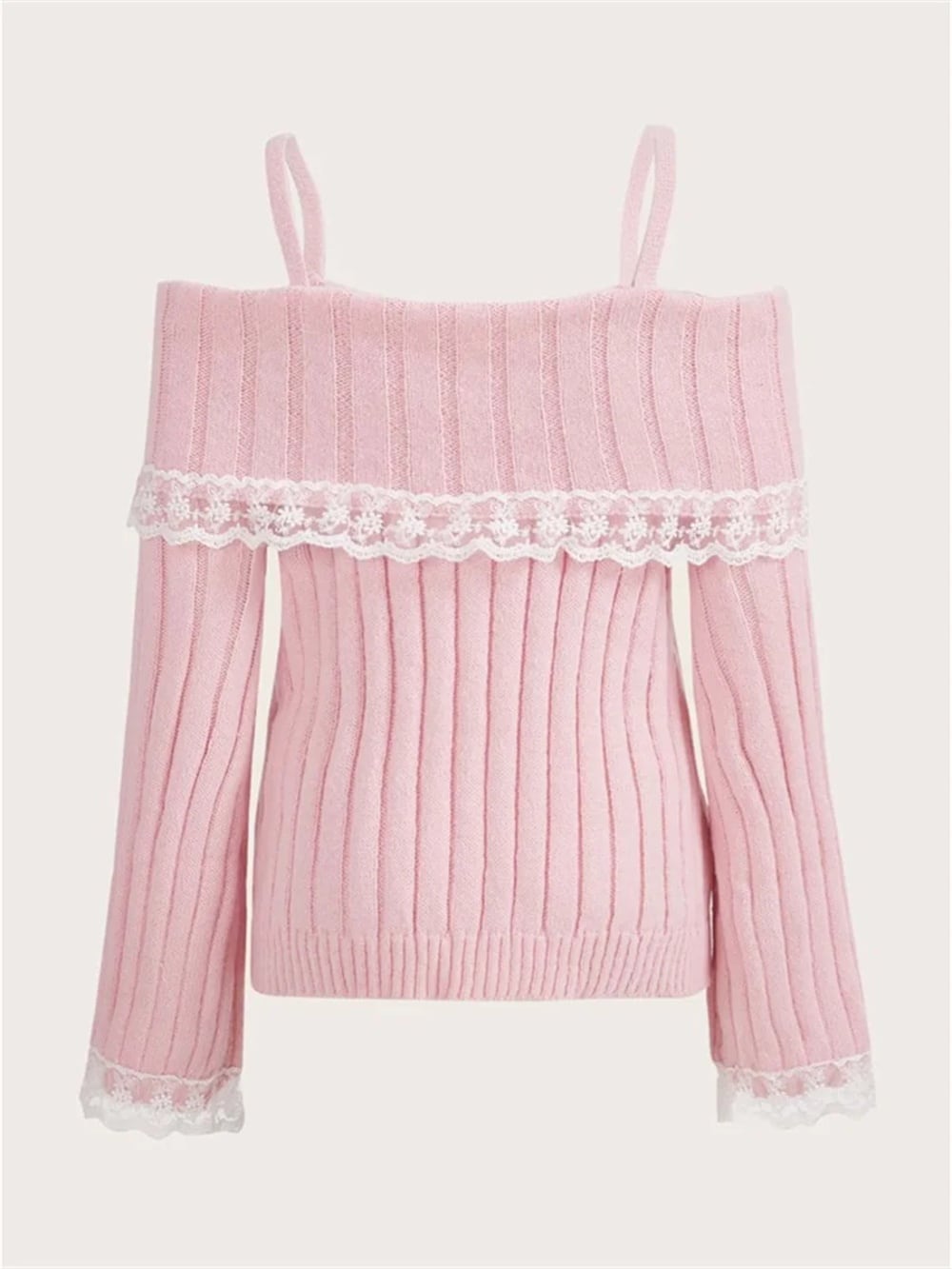 女性のニットオフセーター、ピンクのプルオーバー、スウィートプルオーバー、長袖、ボウレース、パッチワークロンパース、y2kストリートウェア パーカー ジャージ y2k T240908141009_01